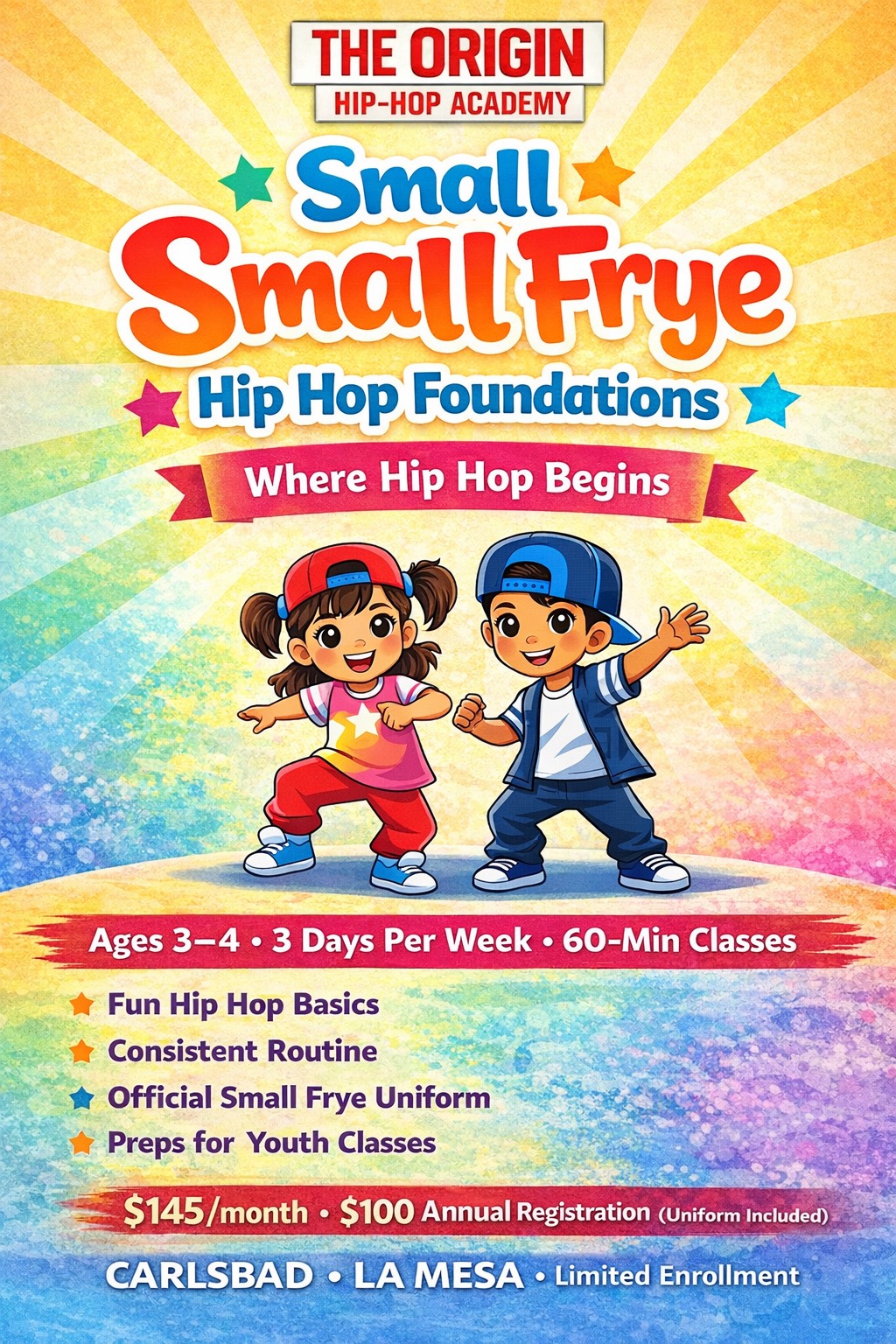 THE ORIGIN DIFFERENCEAt The Origin Hip Hop Academy, we believe early arts education should feel exciting, structured, and empowering. Small Frye Hip Hop Foundations is intentionally designed to help young dancers develop confidence, coordination, and a positive relationship with movement from the very beginning.